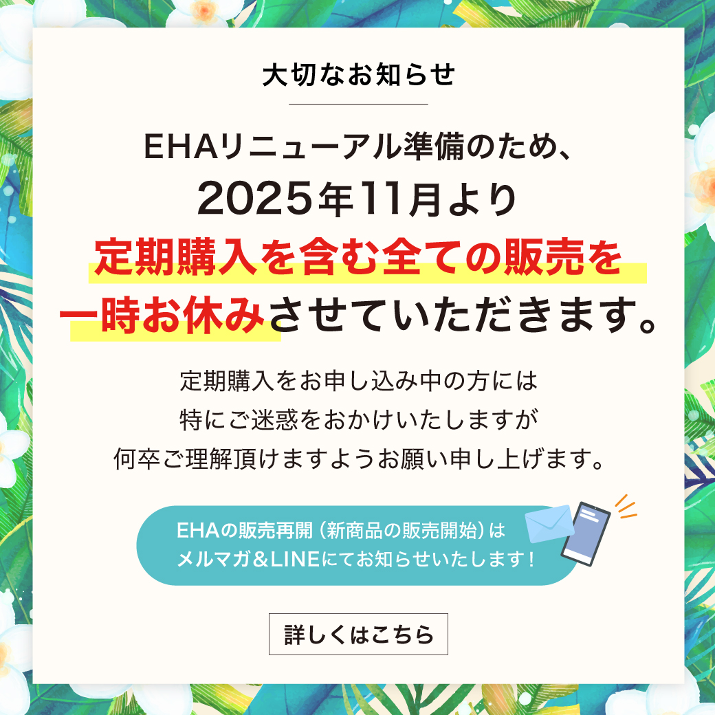 2025年11月1日より、EHAリニューアルの準備に伴い、定期購入を含む全ての商品販売を一時お休みさせていただくこととなりました。