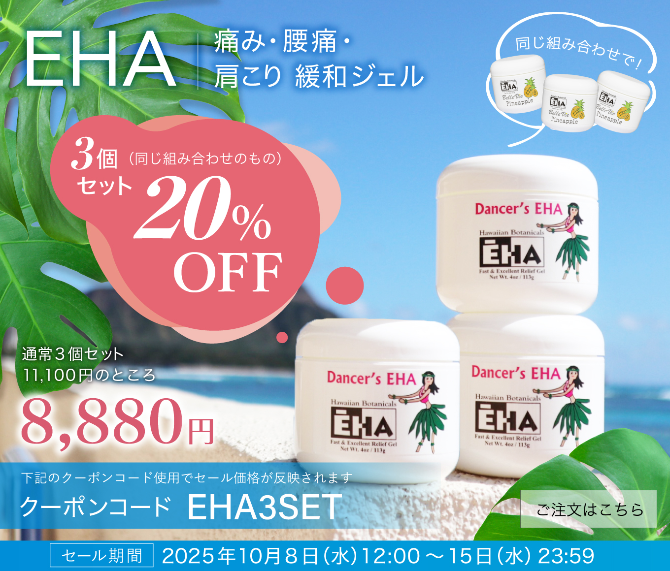 ただいま、「EHA・痛み」緩和ジェルを3個セット20%OFFでお求めいただけるタイムセールを開催中です。